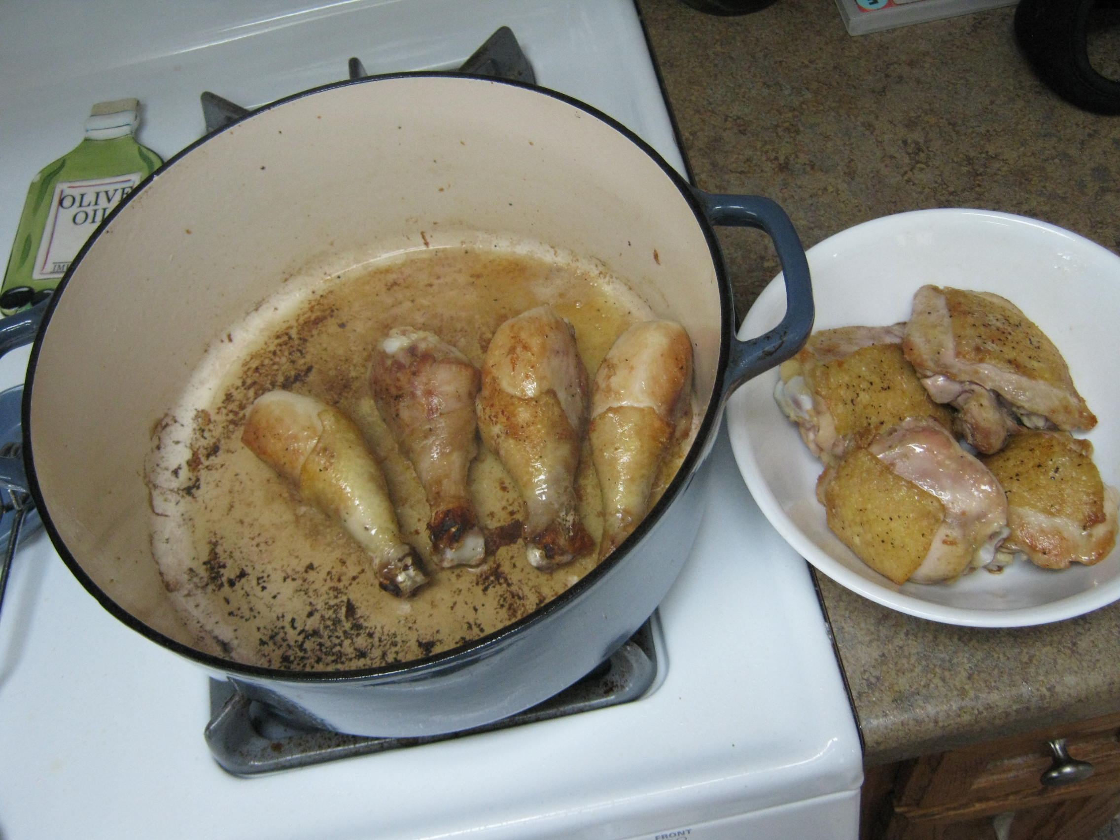 A lot of this recipe’s prep work can be done while other parts are cooking. Start by browning the chicken, in batches, on all sides (start with the skin side down). I did the thighs first, and then set those aside to do the drumsticks. Be really careful when turning the chicken pieces, because the oil is very hot and will splatter. Wear full protective gear or at least something with a long sleeve on the arm you use to turn the chicken. I’ve received self-inflicted oil splatter tattoos on my arm more than once.