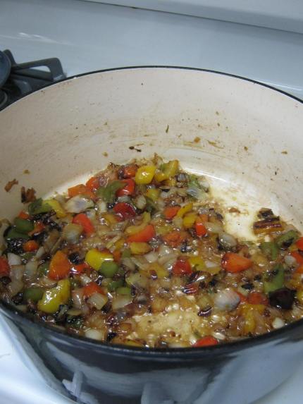 While the chicken is browning, dice the onions and peppers into roughly similar sized pieces. I don’t measure these ingredients terribly closely, but usually end up with about two cups each of onion and peppers. The original recipe calls for equal amounts of green and red peppers, but I like to use a combination of as many peppers as I can find (red, green, yellow, orange), and dice enough to get two cups’ worth.