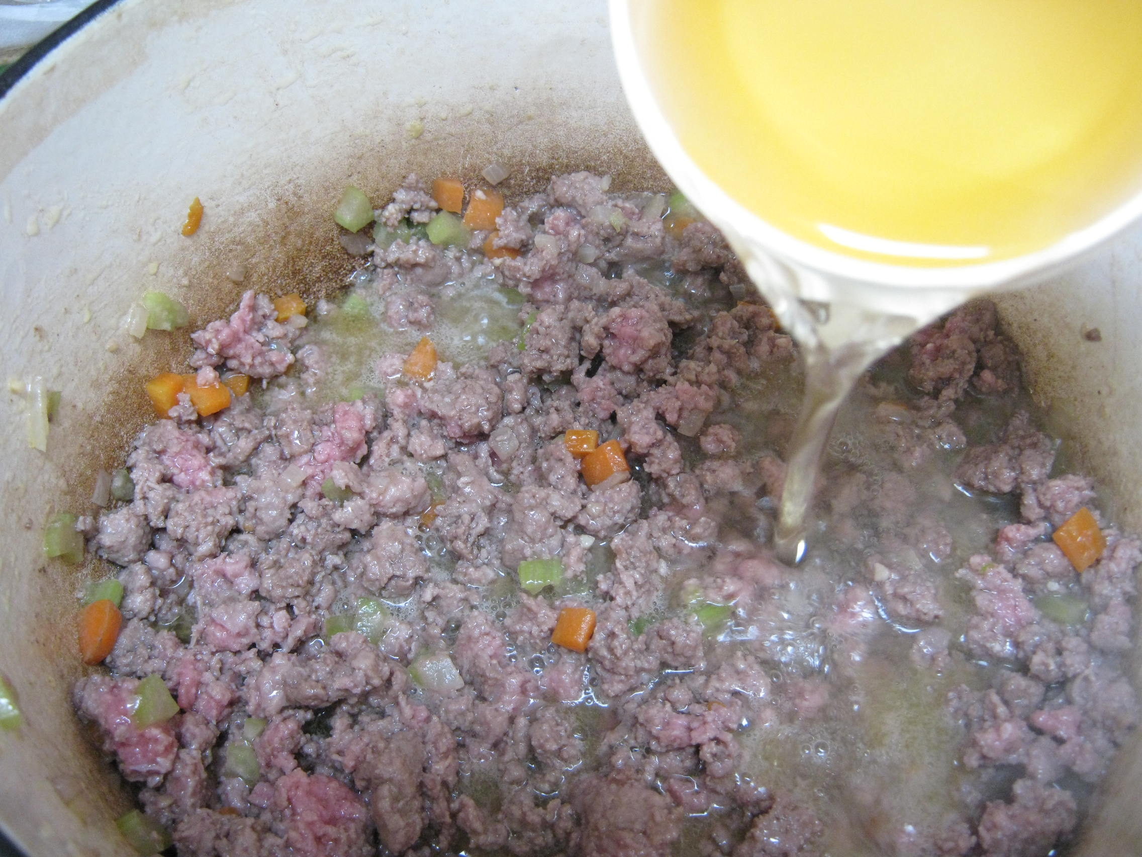In a Dutch oven or large heavy pot, add the onion with the oil and butter and sauté briefly over medium heat until translucent. Add the celery and carrot and cook for 2 minutes. Add the ground beef, crumbling it in the pot with a fork. Add 1 teaspoon salt, stir, and cook only until the meat has lost its red, raw color. Add the wine, turn the heat up to medium high, and cook, stirring occasionally, until all the wine has evaporated, 10 minutes or so.