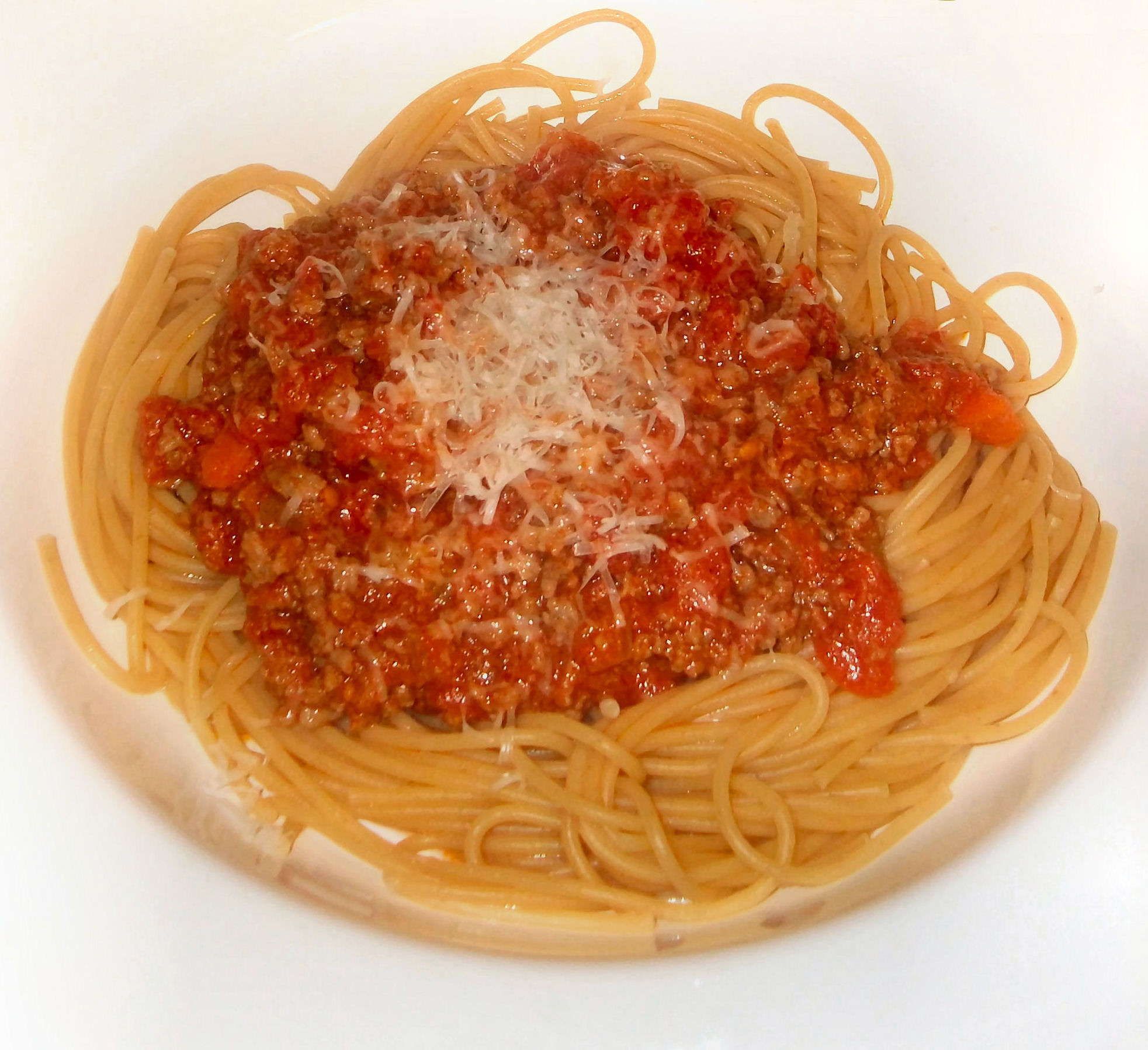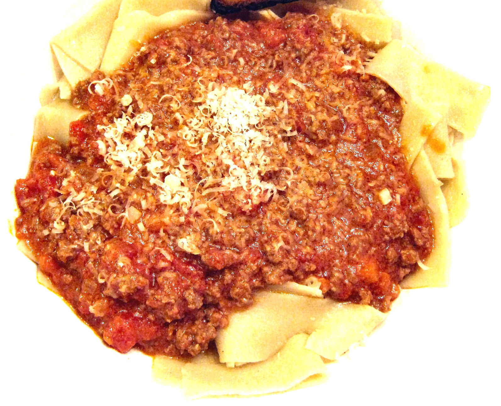 Turn the heat down to medium, add the milk and the nutmeg, and cook until the milk has evaporated. Stir frequently. When the milk has evaporated, add the tomatoes and stir thoroughly. When the tomatoes have started to bubble, turn the heat down until the sauce cooks at the laziest simmer, just an occasional bubble. Add tomato paste and/or vinegar to taste. Cook, uncovered, for a minimum of 3½ to 4 hours, stirring occasionally. Serve over spaghetti or fresh tagliatelle.