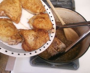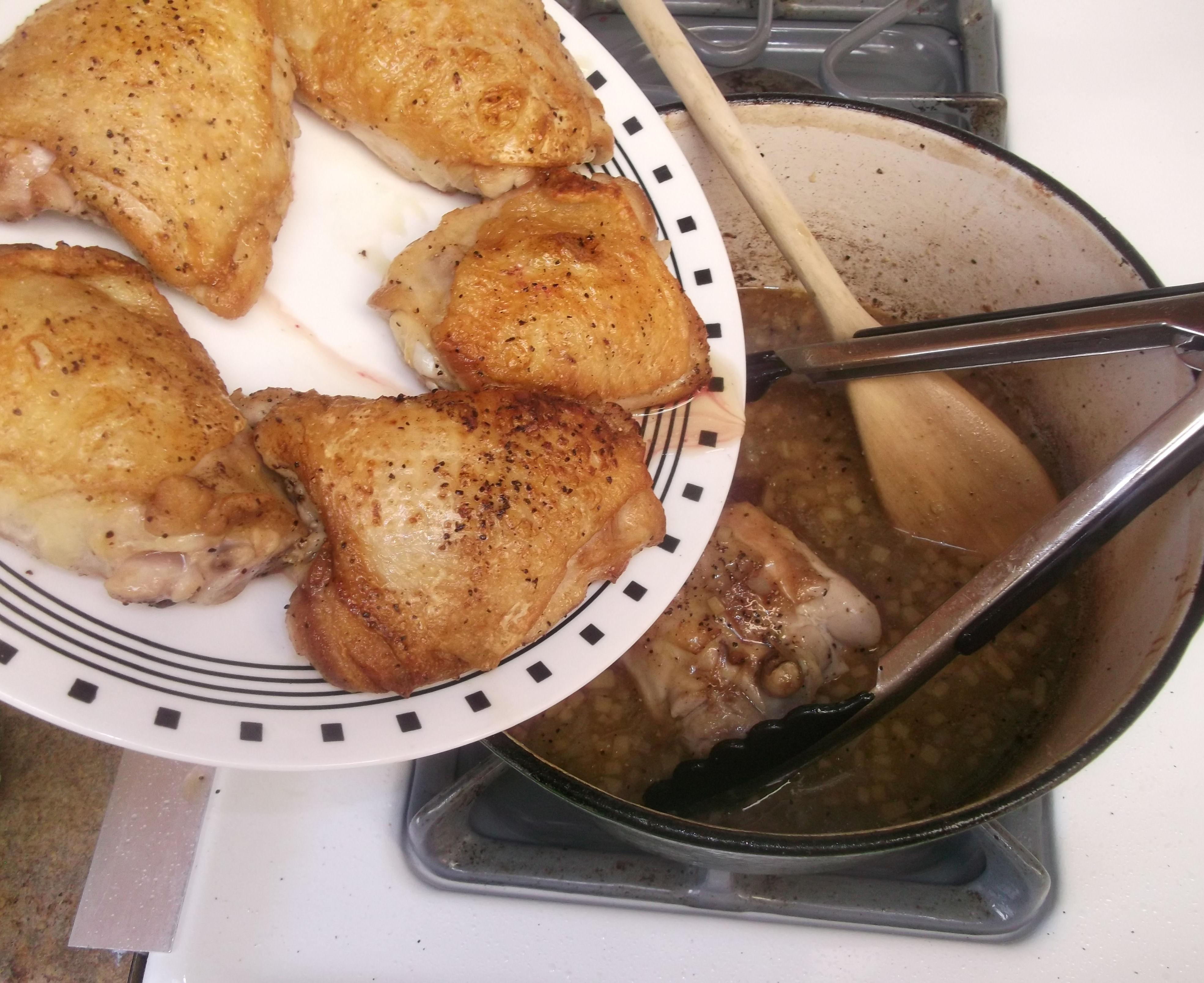 Heat the oil until shimmering, then add the chicken, skin side down first, and brown it in batches. Don’t overcrowd your pot – just put in as many comfortably fit. Think Business Class, with adequate room to stretch and move, not cramped like Coach.