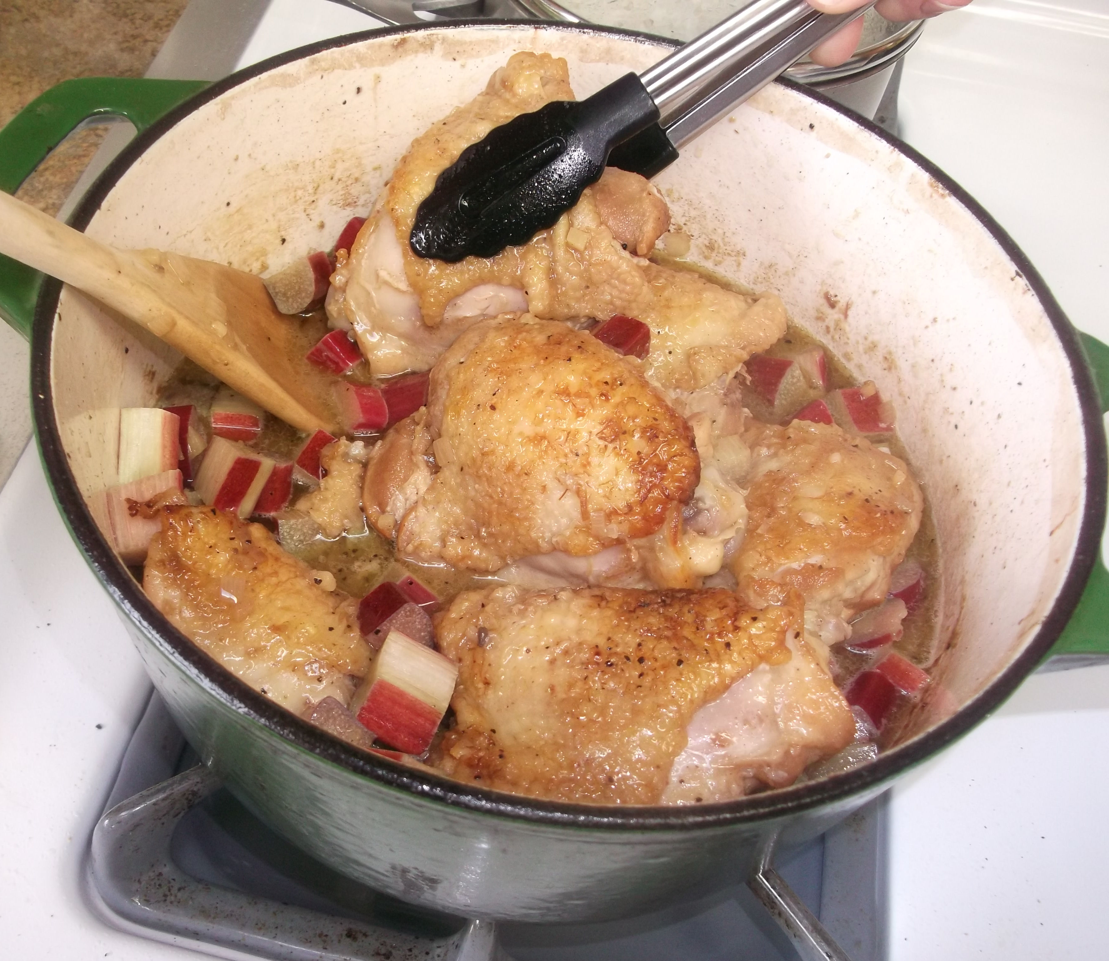 Reduce the heat and simmer until the chicken, when cut with a knife, is no longer pink, about 30-40 minutes. Scatter the rhubarb pieces between and around the chicken, and return to a gentle simmer until the rhubarb is tender, about 10-15 minutes more.