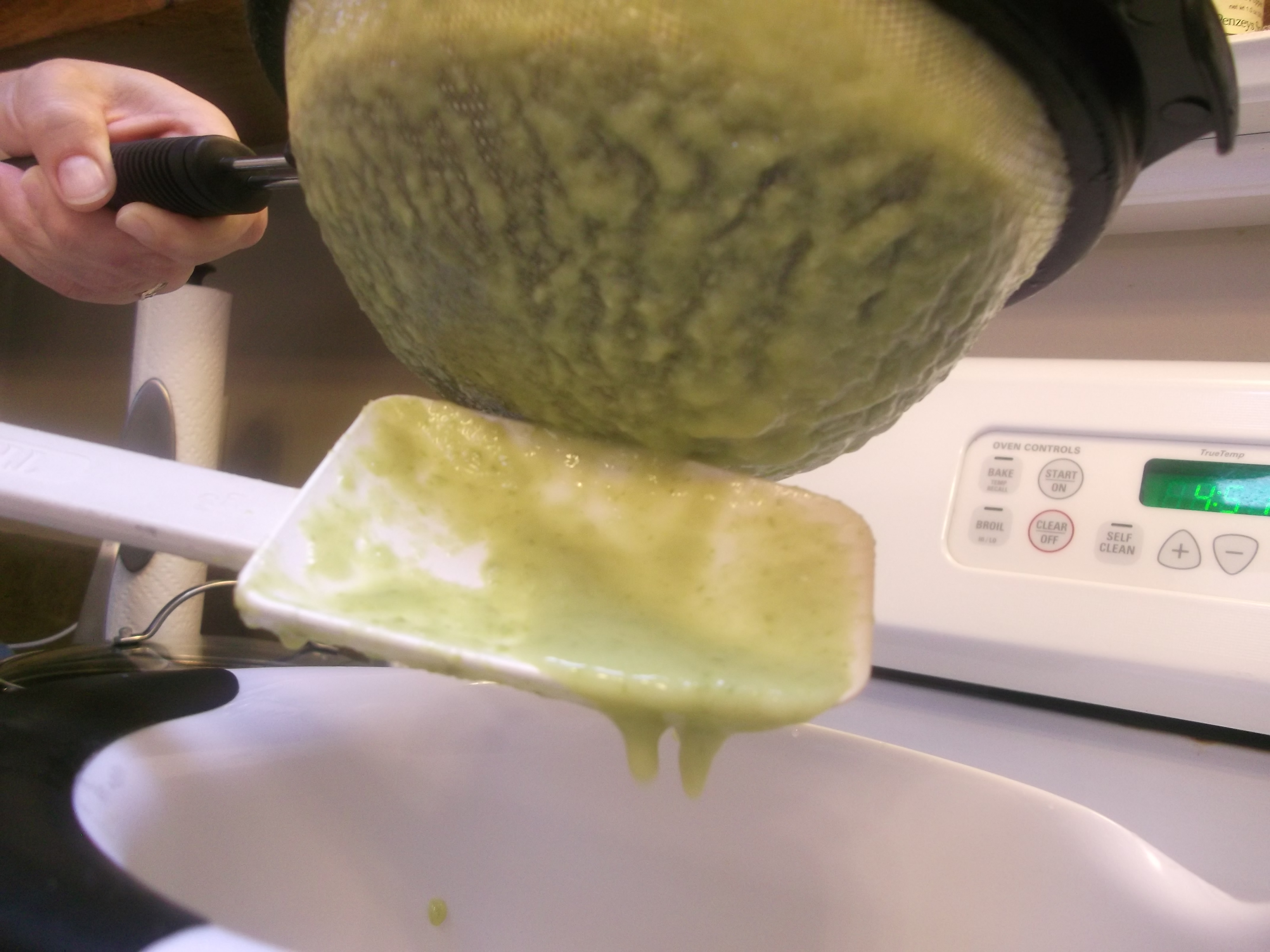 If using a strainer, don’t use too fine a strainer, or it won’t work: it needs to be coarse, with the biggest holes. This step is messy and somewhat time consuming, but it really is worth it. Otherwise you’ve just got asparagus puree, which isn’t nearly as nice to eat as the finished soup will be.