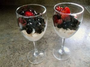 We got several great ideas for recipes, techniques, and all things Dinner Party, but one dessert kept making an appearance: Eton Mess (apparently named after Eton College, where it was first served, although I prefer to think of it more as an Eatin’ Mess). Several of the contestants made this dessert, and it was always a big hit. I happened to see a recipe for it and decided to try it. What a great way to use fresh seasonal berries! The link to the original recipe is here, but I have modified it to make it easier to make and much lower in fat.