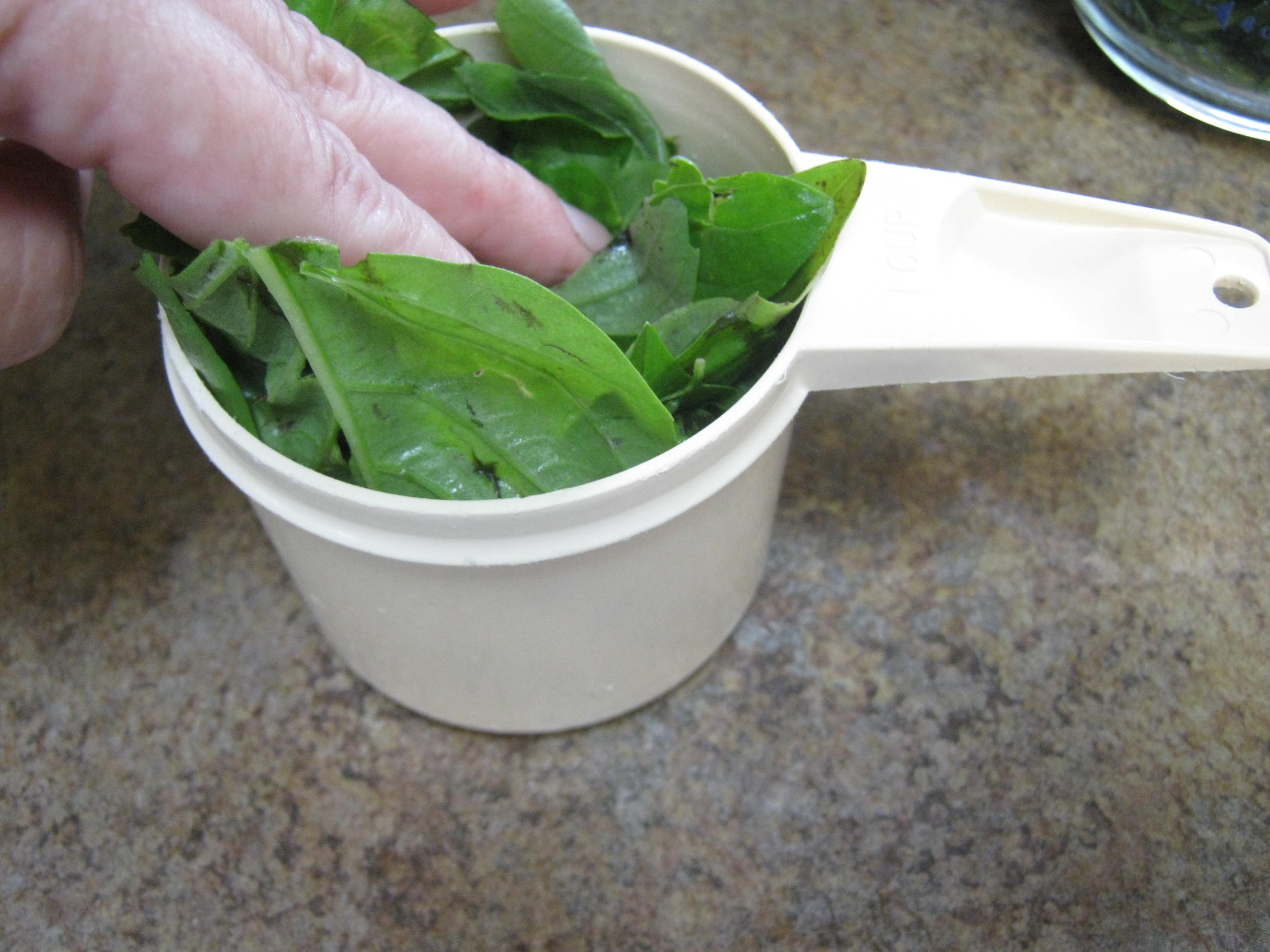 But I digress. Back to the basil. Once you have the leaves washed and dried, measure out 3 cups’ worth, packing them in pretty tight.