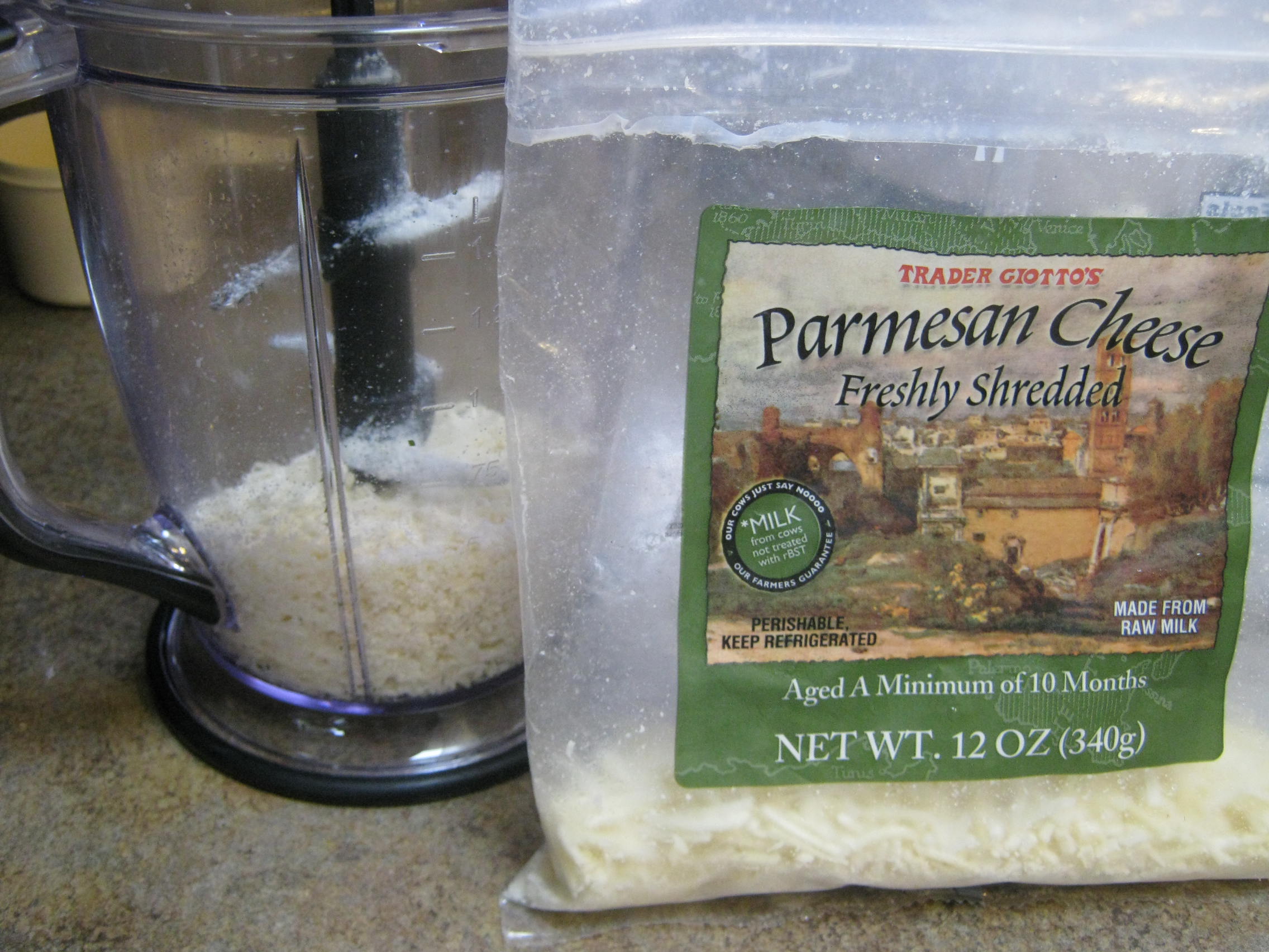 The final step is to add the grated cheese. Use a hard Italian cheese, like Parmigiano-Reggiano or Parmesan, and grate it finely (if you didn’t buy it already grated). Grate it by hand with a microplane grater or cheese grater (using the smallest holes), or, since the blender is dirty anyway, just wipe it out and add small chunks of hard Italian cheese. Pulse to grate. Here, I used shredded Parmesan and grated it to a fine texture.