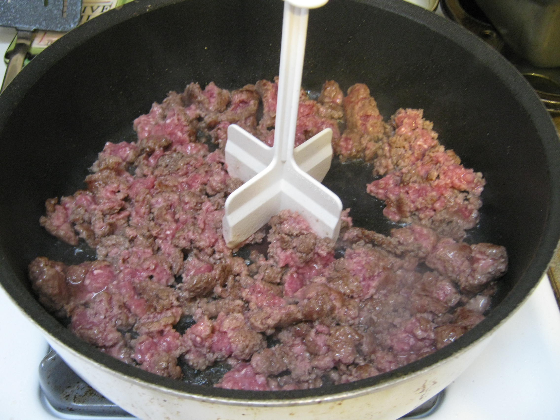 Start by browning the ground beef over medium-high heat.