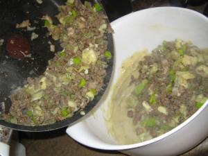 Add the ground beef mixture to the bowl and mix well.