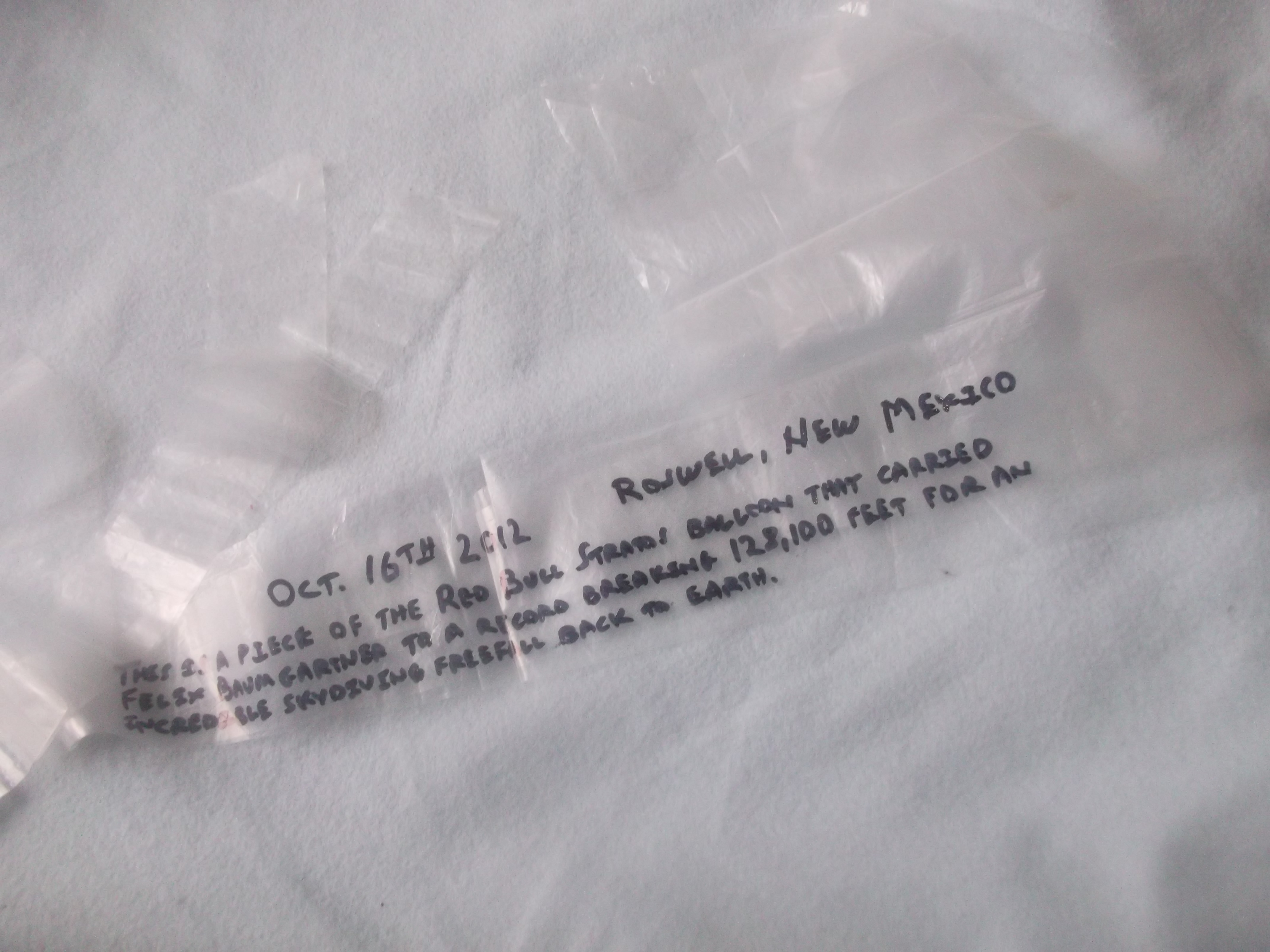 Before we get cooking, I want to share this photo I was lucky enough to get of a piece of the balloon that took him to 128,000+ feet above New Mexico for his remarkable jump.