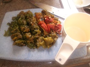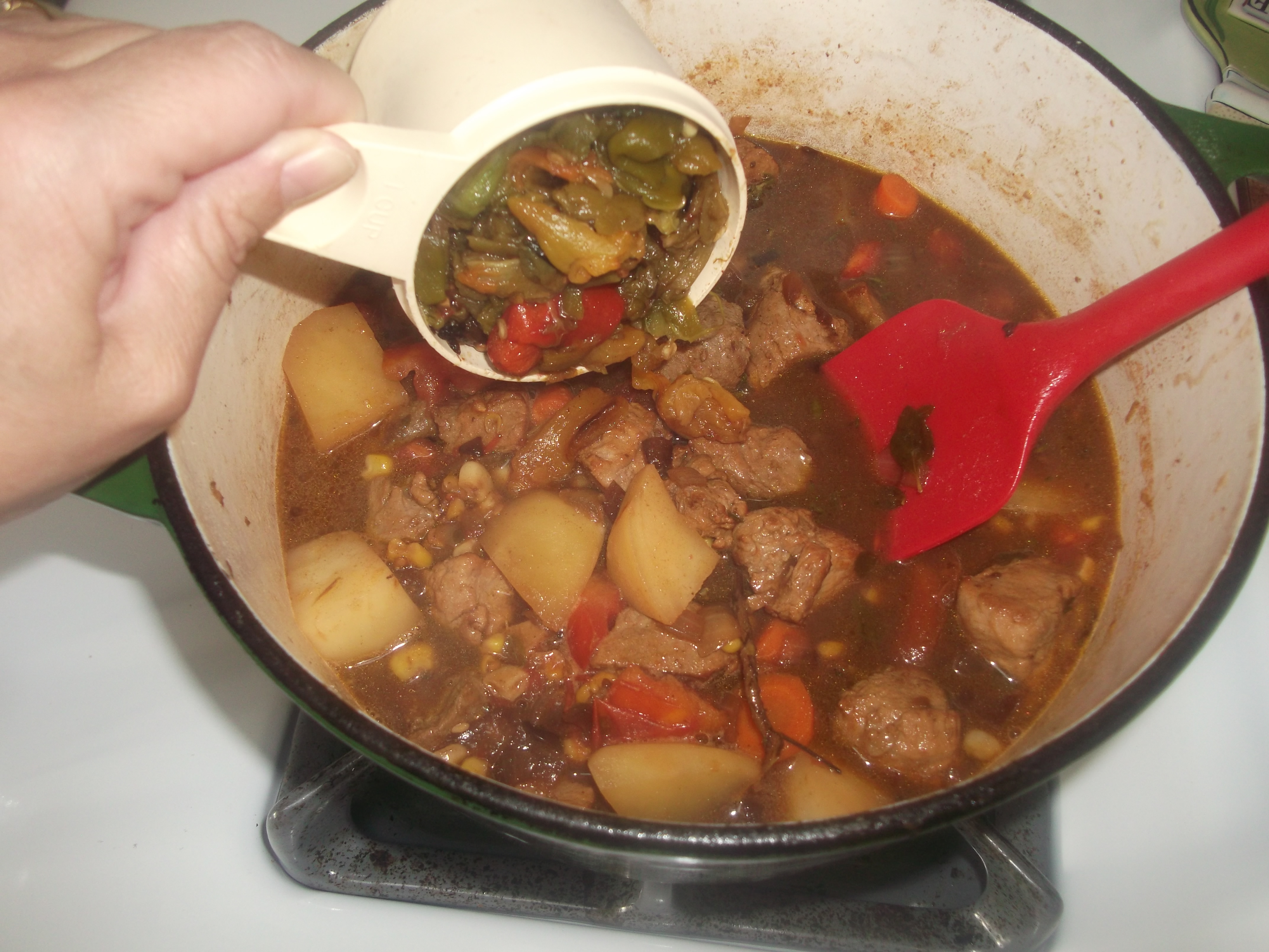 8-12 hot chile peppers (or Hatch green chiles), roasted, seeds and skins removed, and chopped to yield ½ C (use fewer hot peppers and/or milder peppers for a less spicy stew; more for a hotter one – when I used 1 C of hot peppers it was VERY hot)