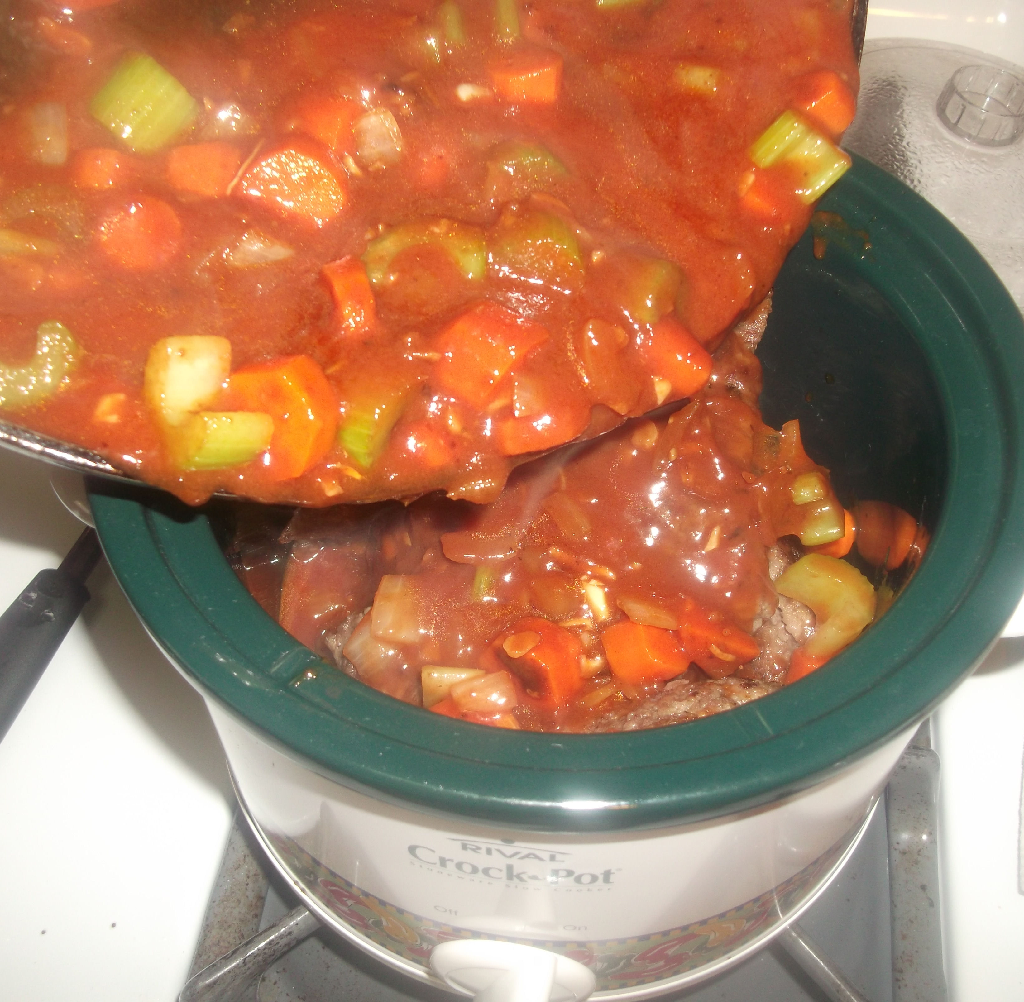 Carefully pour the mixture into the crock pot. It helps if your pan is as wide as your crock pot. Mine wasn’t, so it took some extra effort to make sure it all arrived safely into the pot.