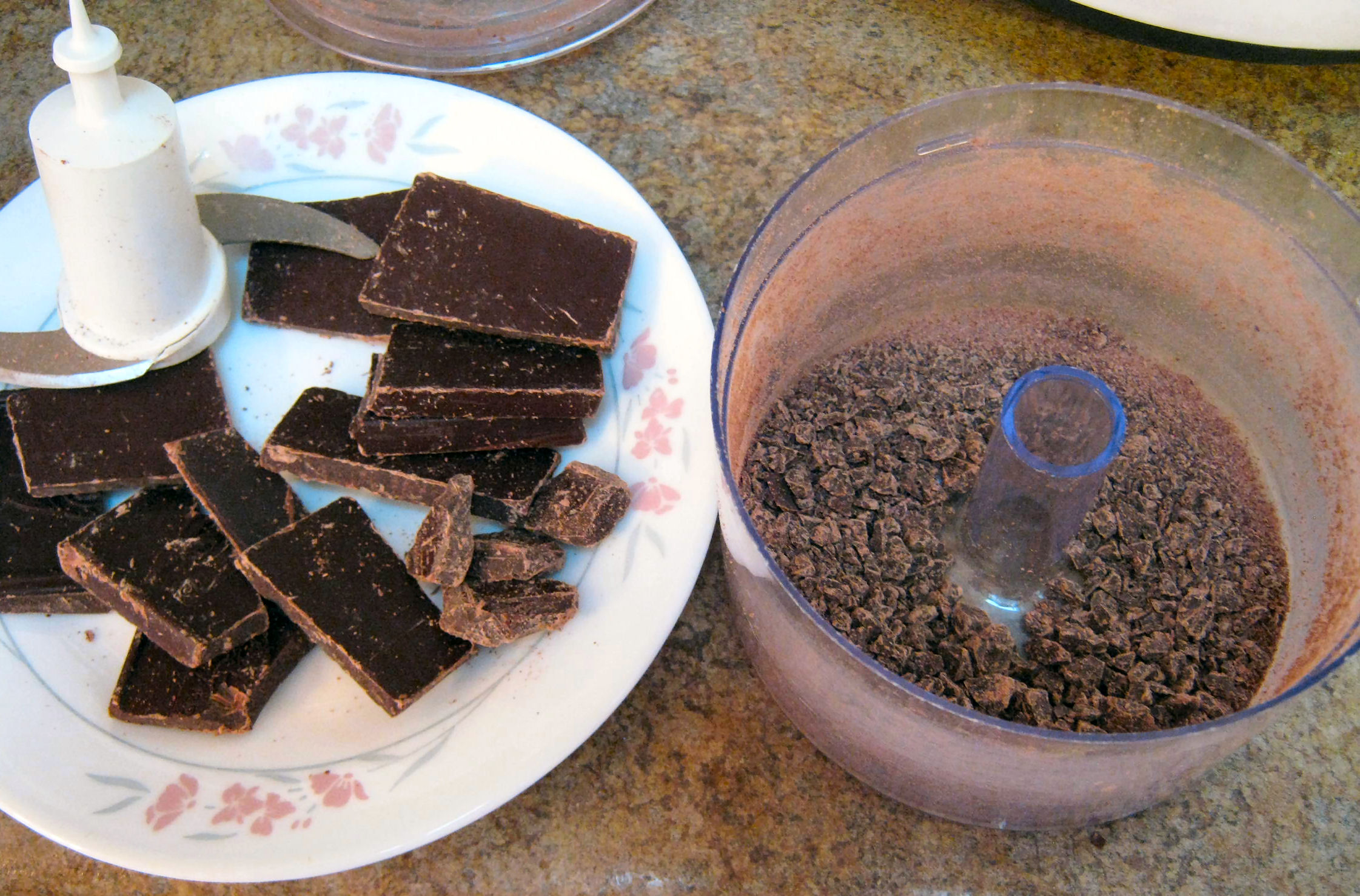 Grind the dark chocolate in a food processor. It helps to chill it slightly beforehand and break it apart, but break it into smaller pieces than shown here.