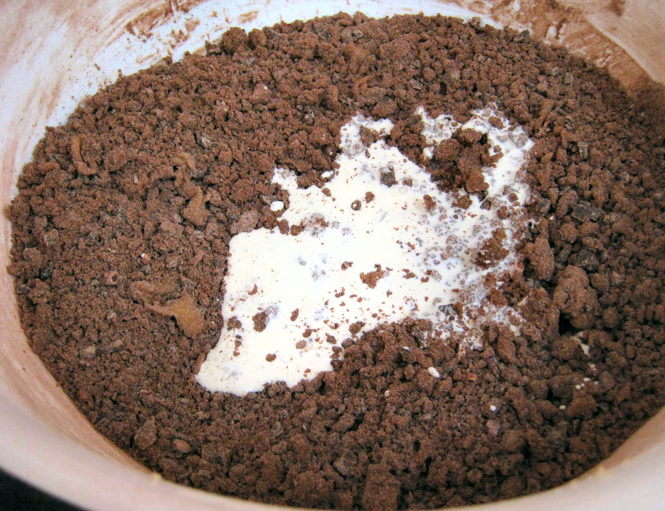 Mix just until the dry ingredients are incorporated: do not over mix. The mixture will be rather dry and crumbly. Then pour in the cream.
