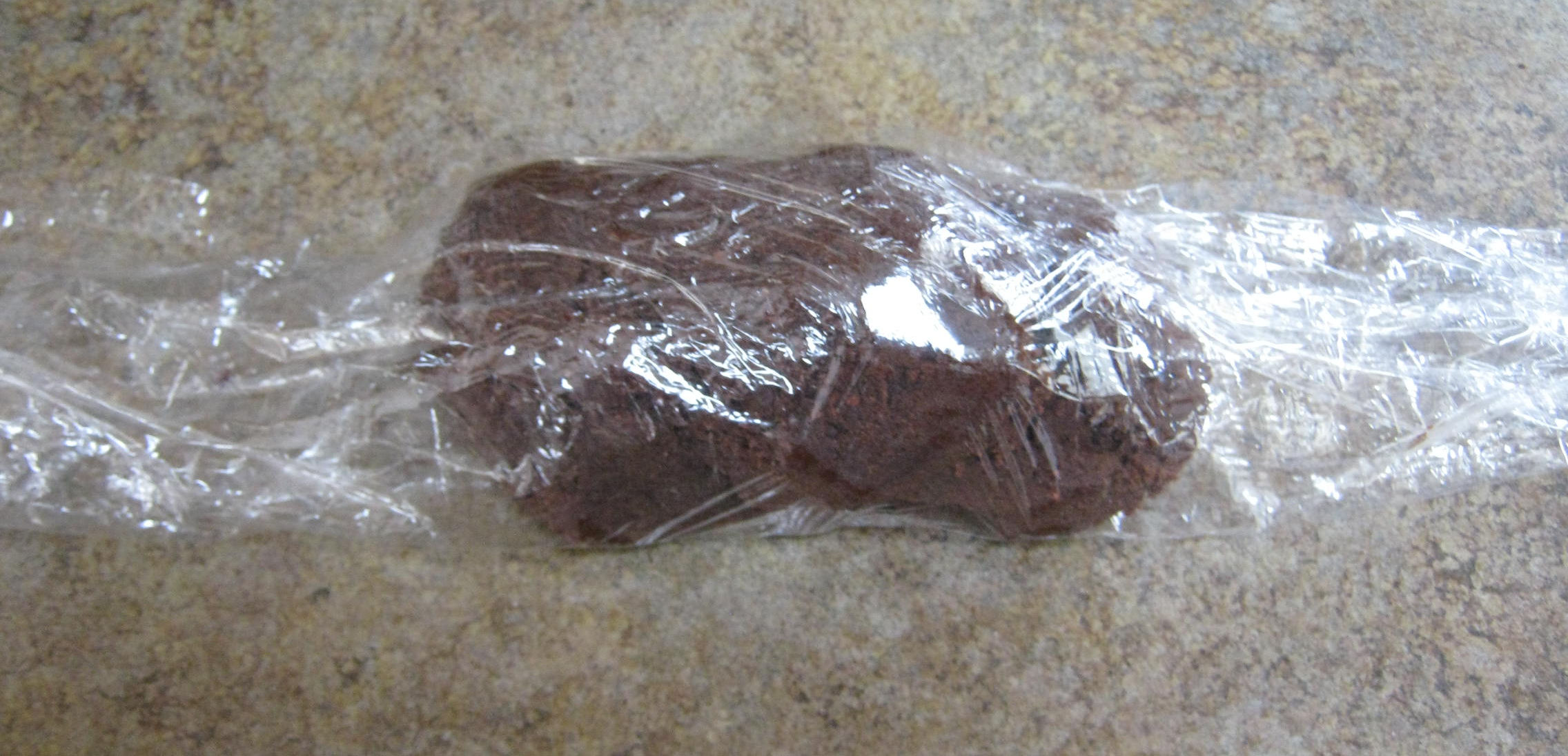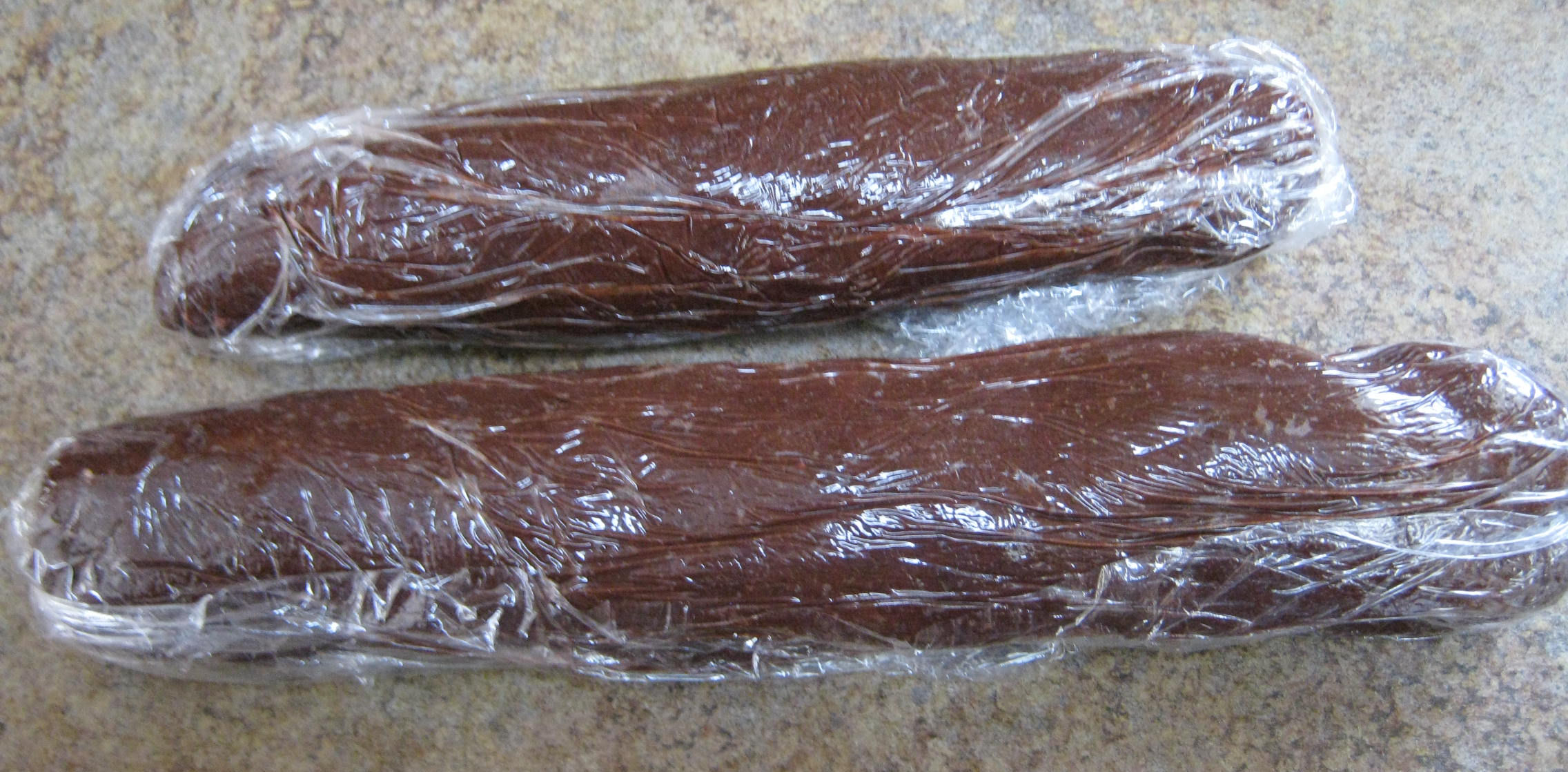 Roll the dough, still in the plastic, into a log about 2” wide. Repeat with the other half of the dough. Don’t worry if your halves aren’t exactly half: mine obviously weren’t.