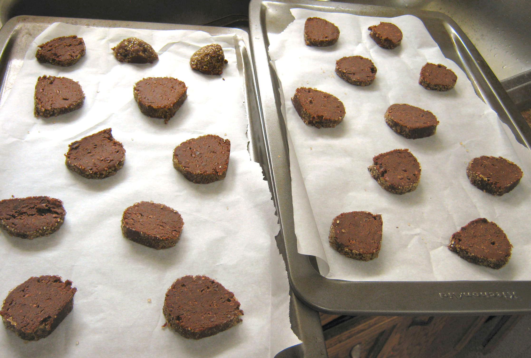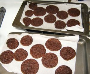 Put the slices a couple inches apart on the lined cookie sheets. The cookies will spread, so leave adequate space between them.