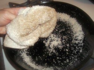 Take a clean DRY dishrag (remember, keep water and all things wet away from cast iron!) and rub the paste all around the pan. The grit from the salt will scrape up any dried food, or even any rust spots if you exposed your pan to water prior to reading this tip.