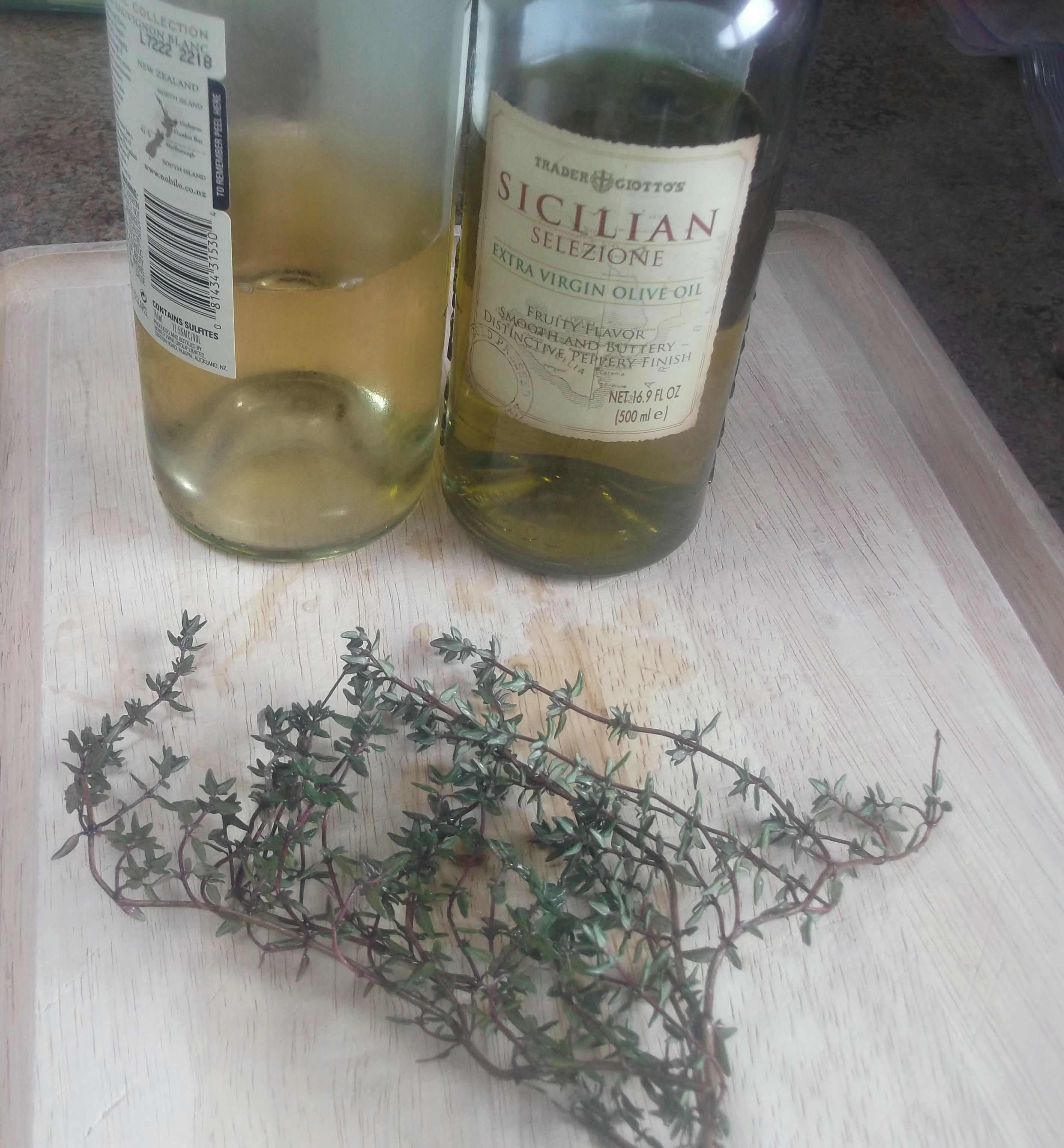Get some fresh sprigs of thyme, good quality extra virgin olive oil, and a dry white wine. I usually use a dry/neutral Pinot Grigio, but whatever you use, just make sure it isn’t too sweet or fruity or it will overpower the leeks.