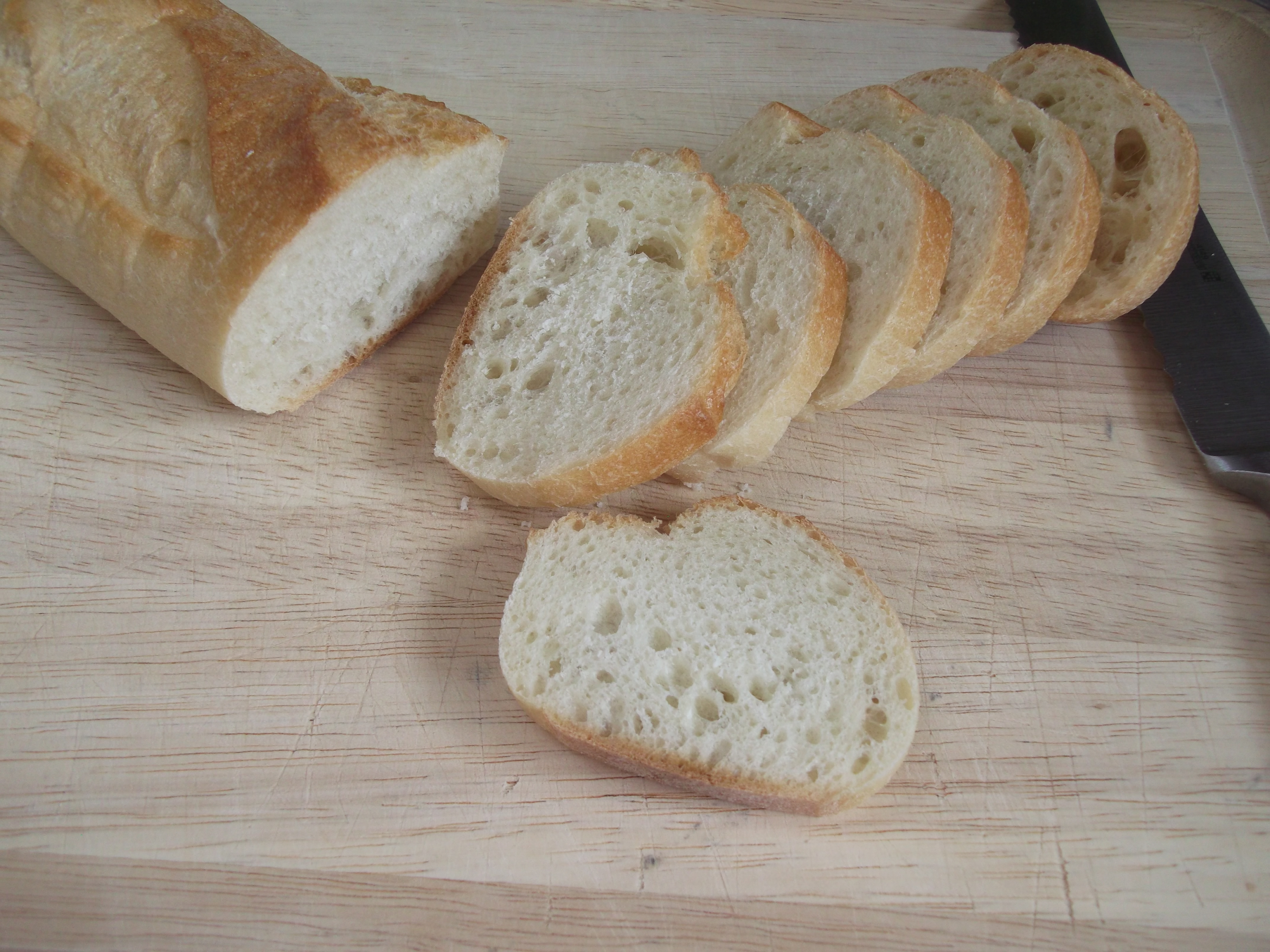 Make the croutons. Slice a baguette into ¼” slices and toast both sides by placing them in a single layer on a baking sheet. Either bake them at 400 degrees F, or place them under the broiler until the bread is dry, crisp, and golden at edges, about 10 minutes. Turn and toast the other side until lightly browned. Set aside. Alternatively, smaller batches of bread can be toasted in a toaster oven until browned.