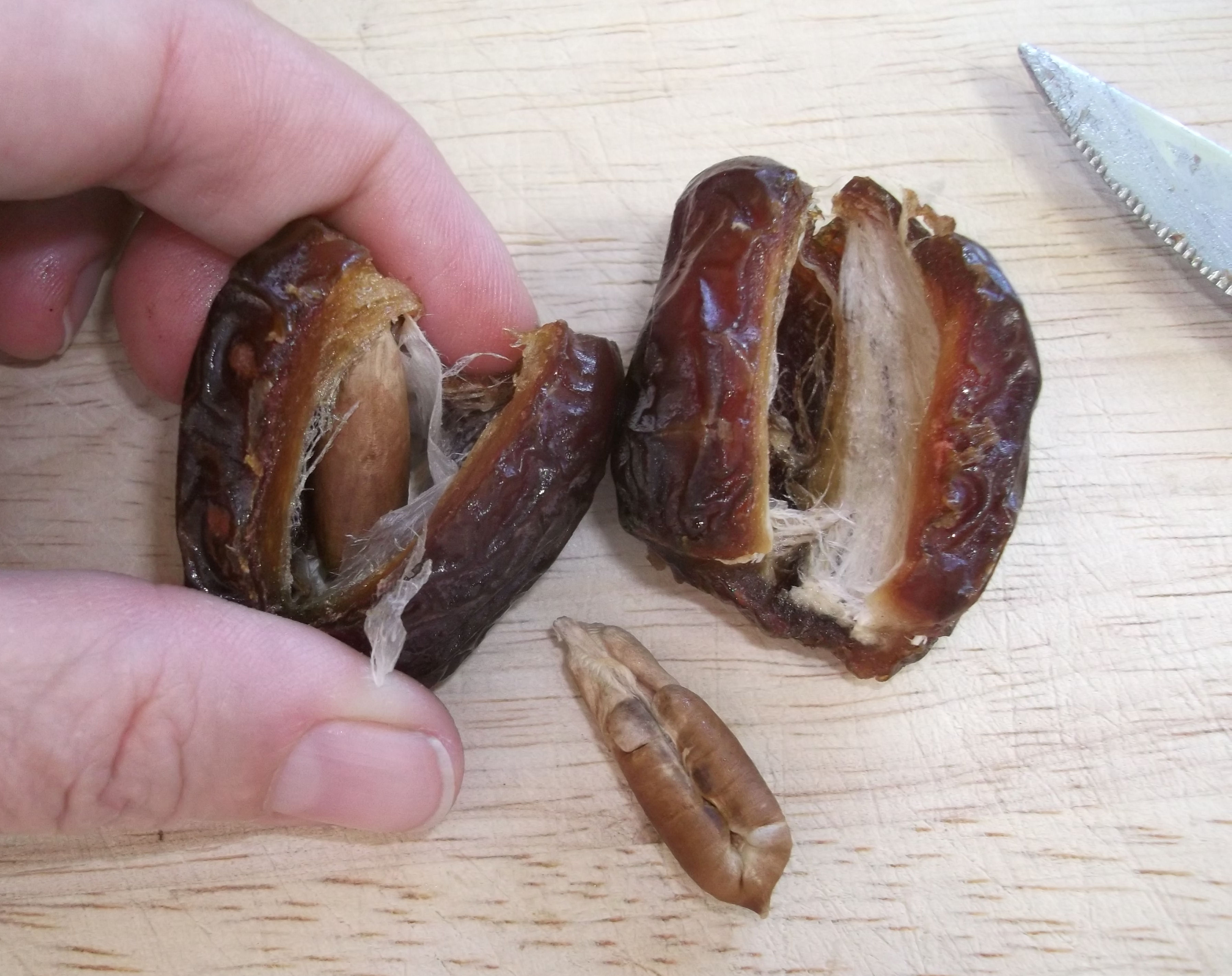 Gently squeeze the date open and remove the pit. Remove any papery bits stuck to the pit, too, if you want.
