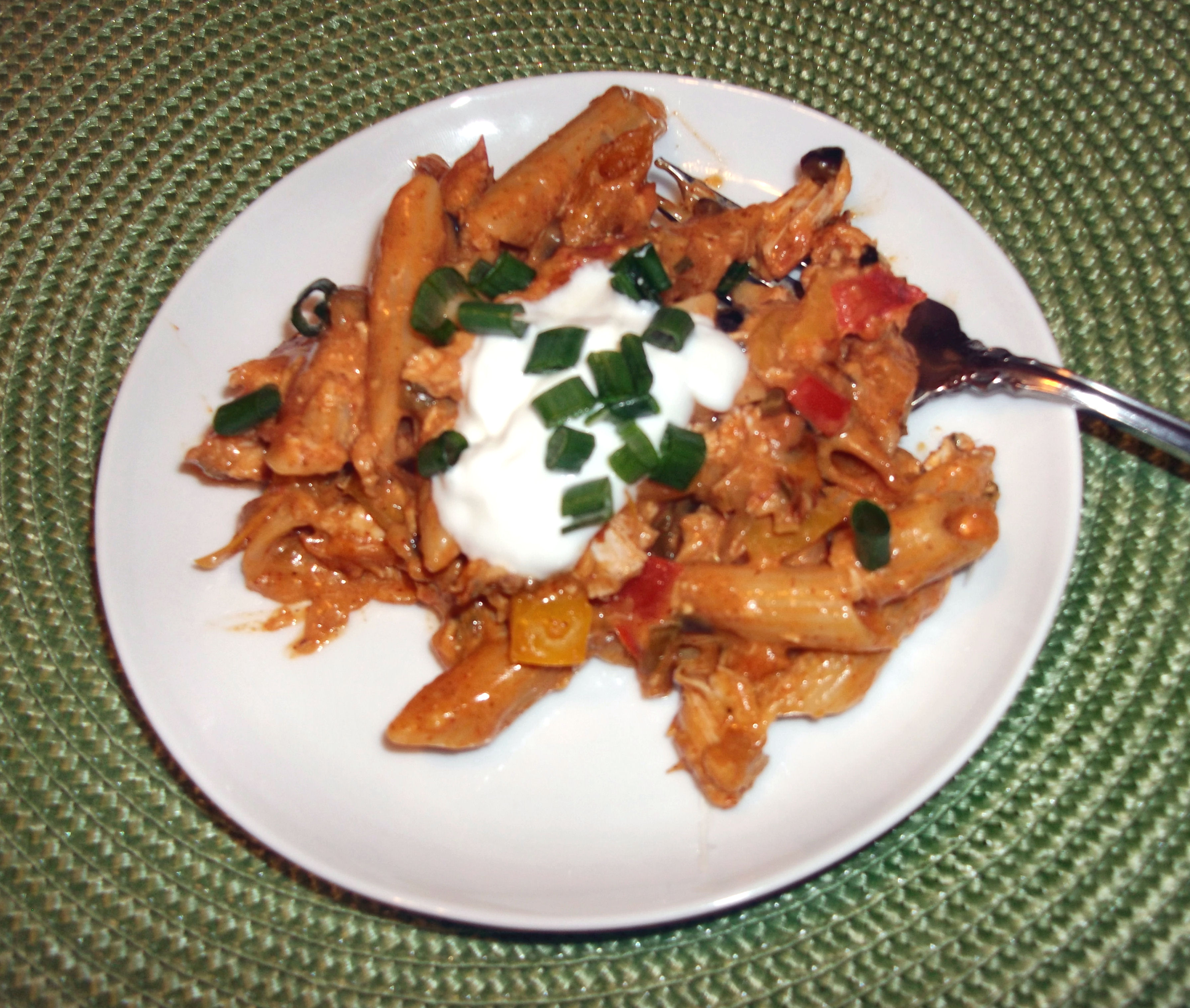 I thought up the idea of making a pasta dish with enchilada sauce a long time ago, but never quite got around to it until I saw it on another blog and realized how amazing it looked. I used some of the ideas I saw there when I created my recipe. This dish makes a nice change from regular Mexican enchiladas, and I guess it makes a nice change from regular Italian pasta dishes, too. Hmm. Either way, it’s something different, super yummy, and a great way to use up leftover chicken.