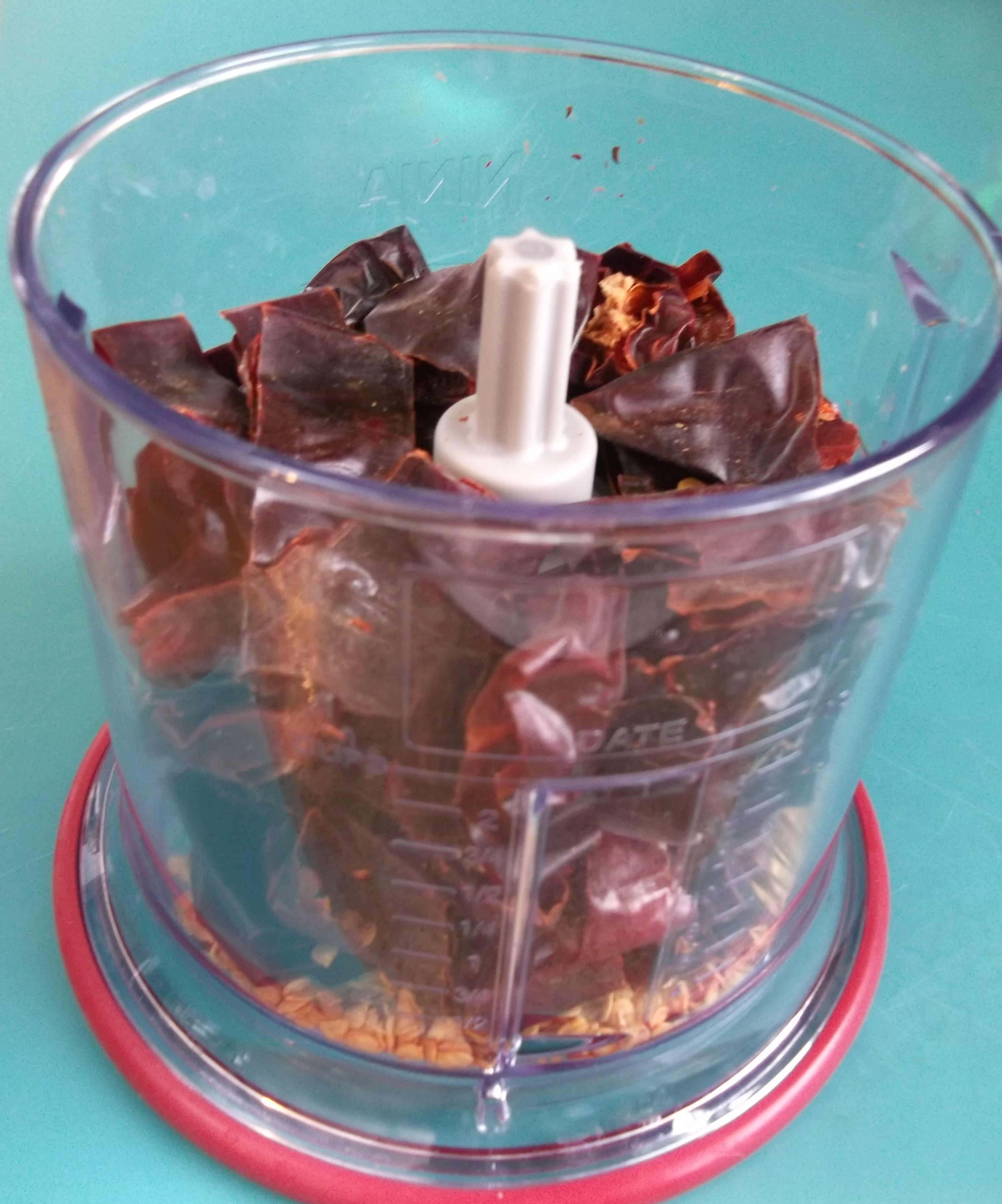Place the red chiles — and the seeds — in the food processor.