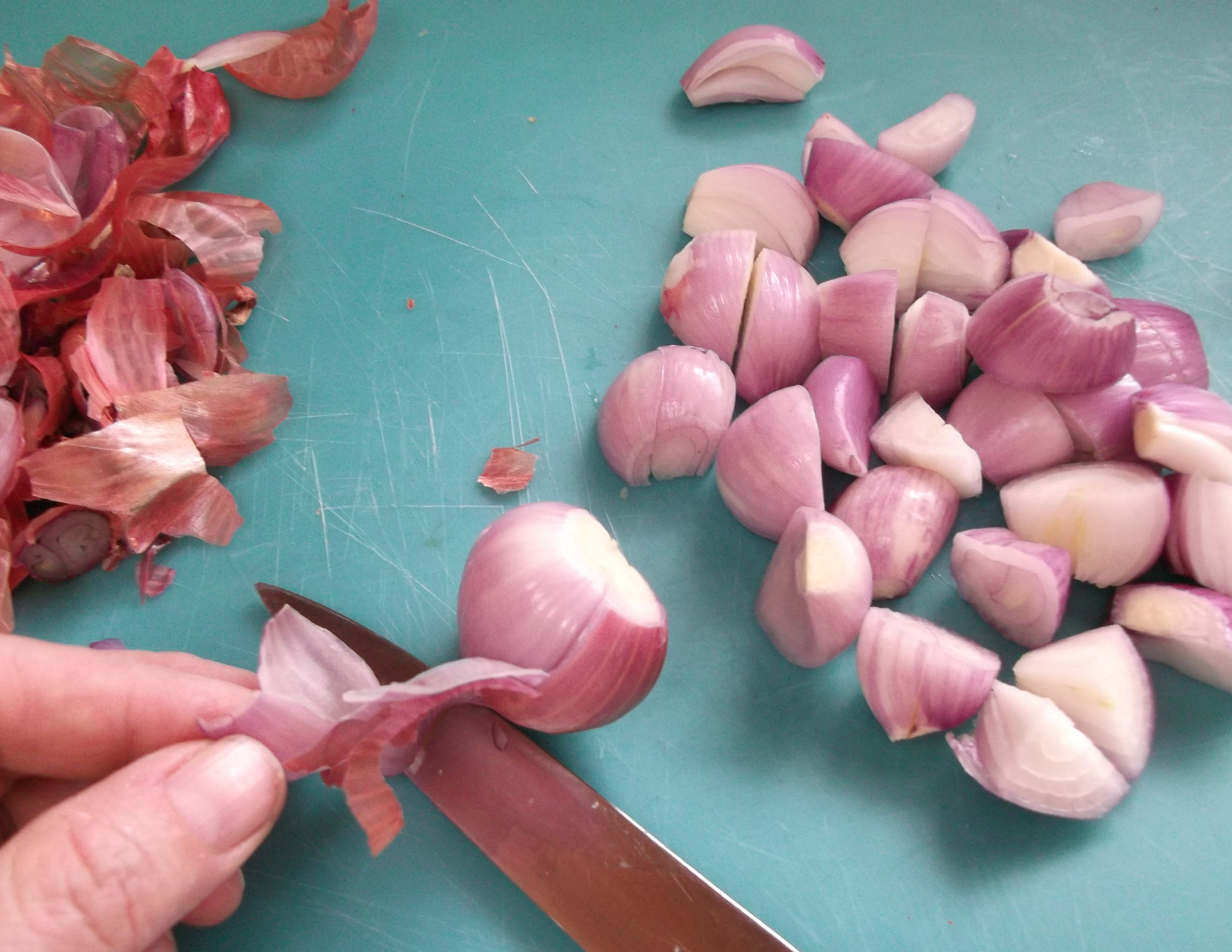 Smash and peel the garlic cloves, and peel and coarsely chop the shallots: just so that they are about the same size as the garlic cloves.