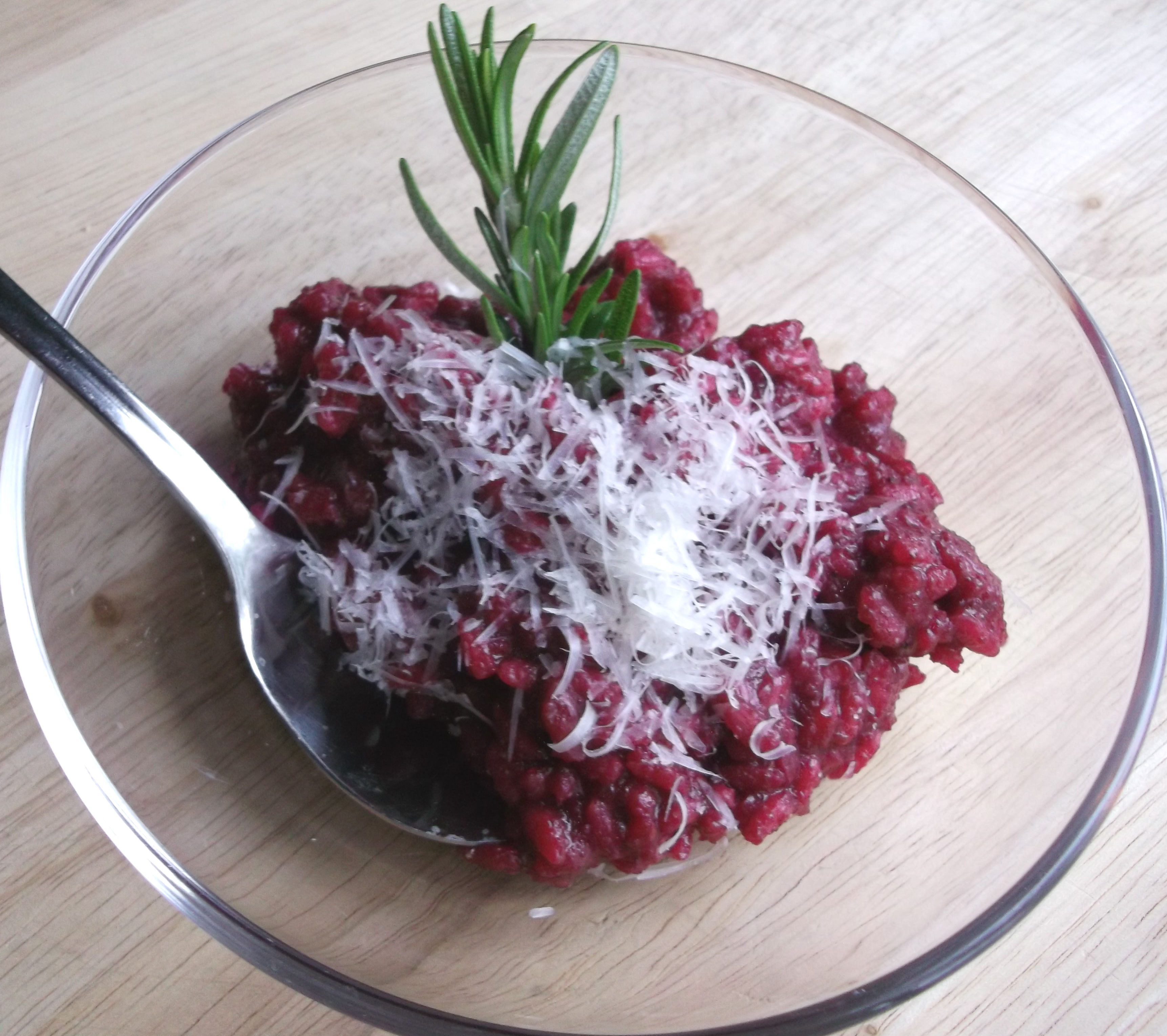 Keep adding the stock and stirring, and with the last ladle of stock, add the sprig of rosemary, if using, to the pan. Continue stirring until the risotto is creamy but its texture is still firm to the bite. Add the beet puree, mix it in well, and keep stirring until the risotto is creamy and soft, with an al dente bite to it. Stir in the grated parmesan; add salt and pepper to taste. Remove the bay leaf and rosemary. Enjoy!
