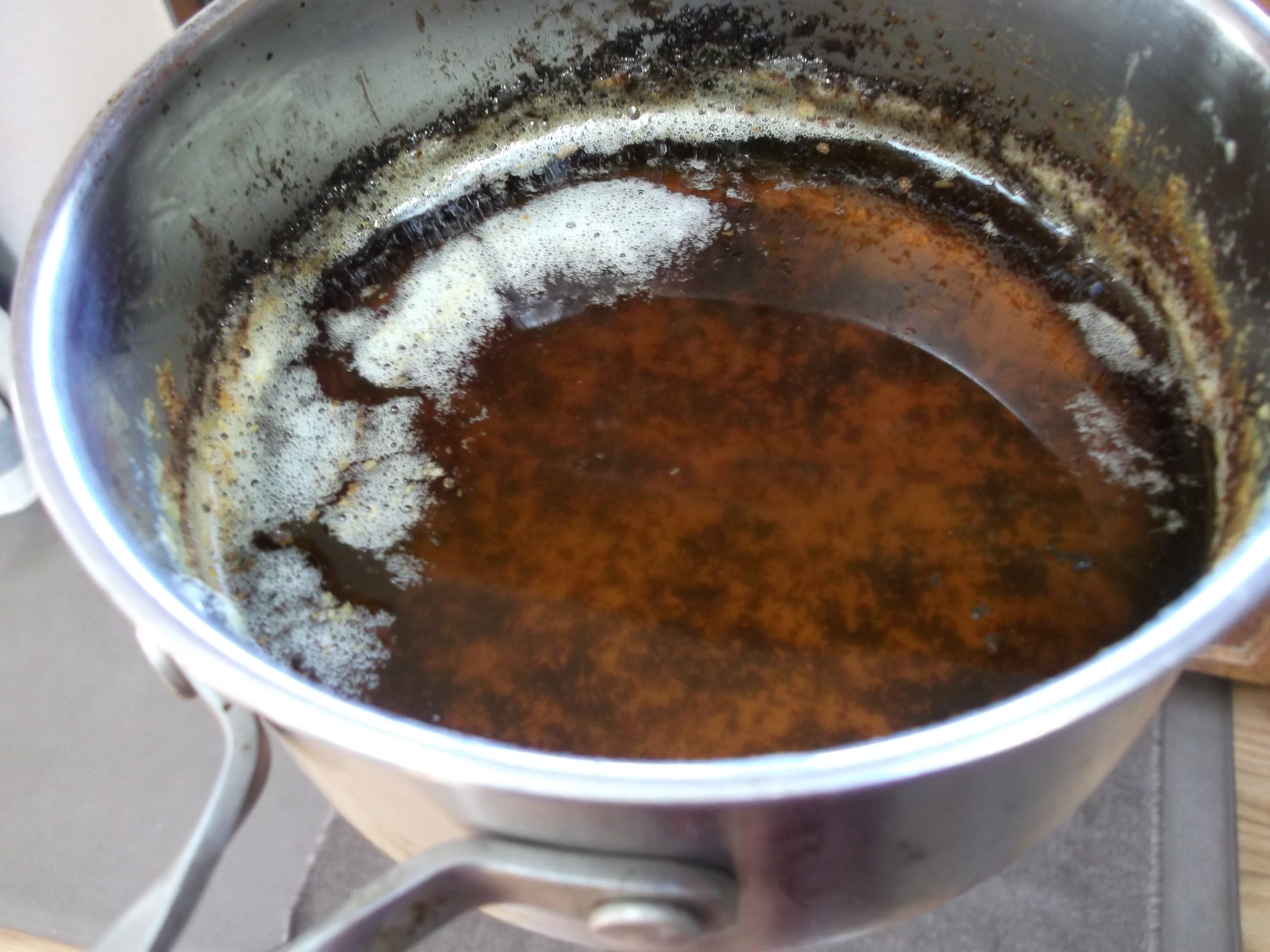 Maintain a gentle boil until the liquid becomes dark amber/orange and is very clear. This may take 10 to 20 minutes. As it simmers, the milk solids from the butter will sink to the bottom of the pan and eventually turn very dark.