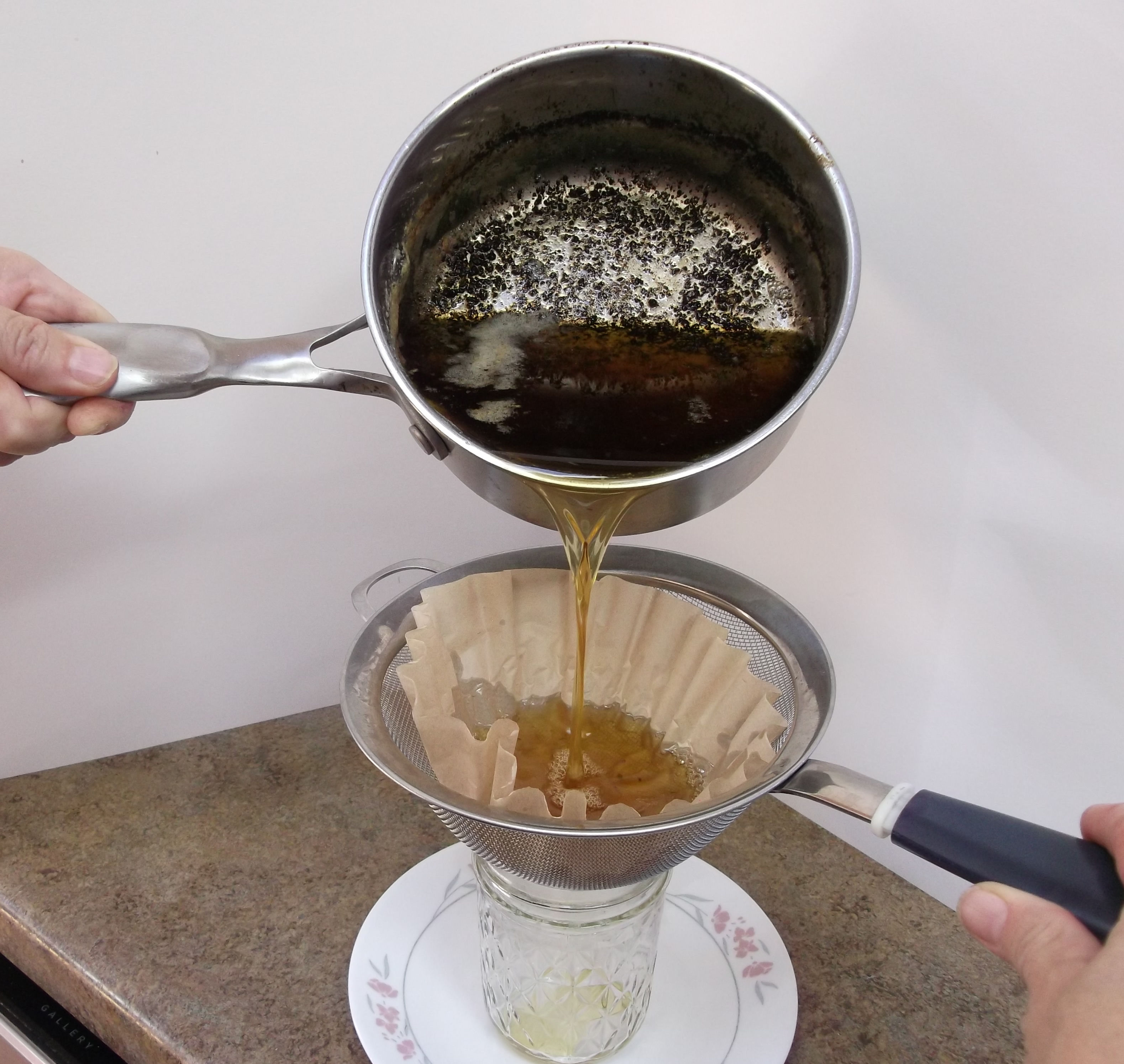 Remove the pan from the heat and allow it to cool for about 15 minutes. Line a sieve with a coffee filter and place it over a clean and dry glass jar. Carefully pour the liquid through the sieve into a clean, dry glass jar or other container.