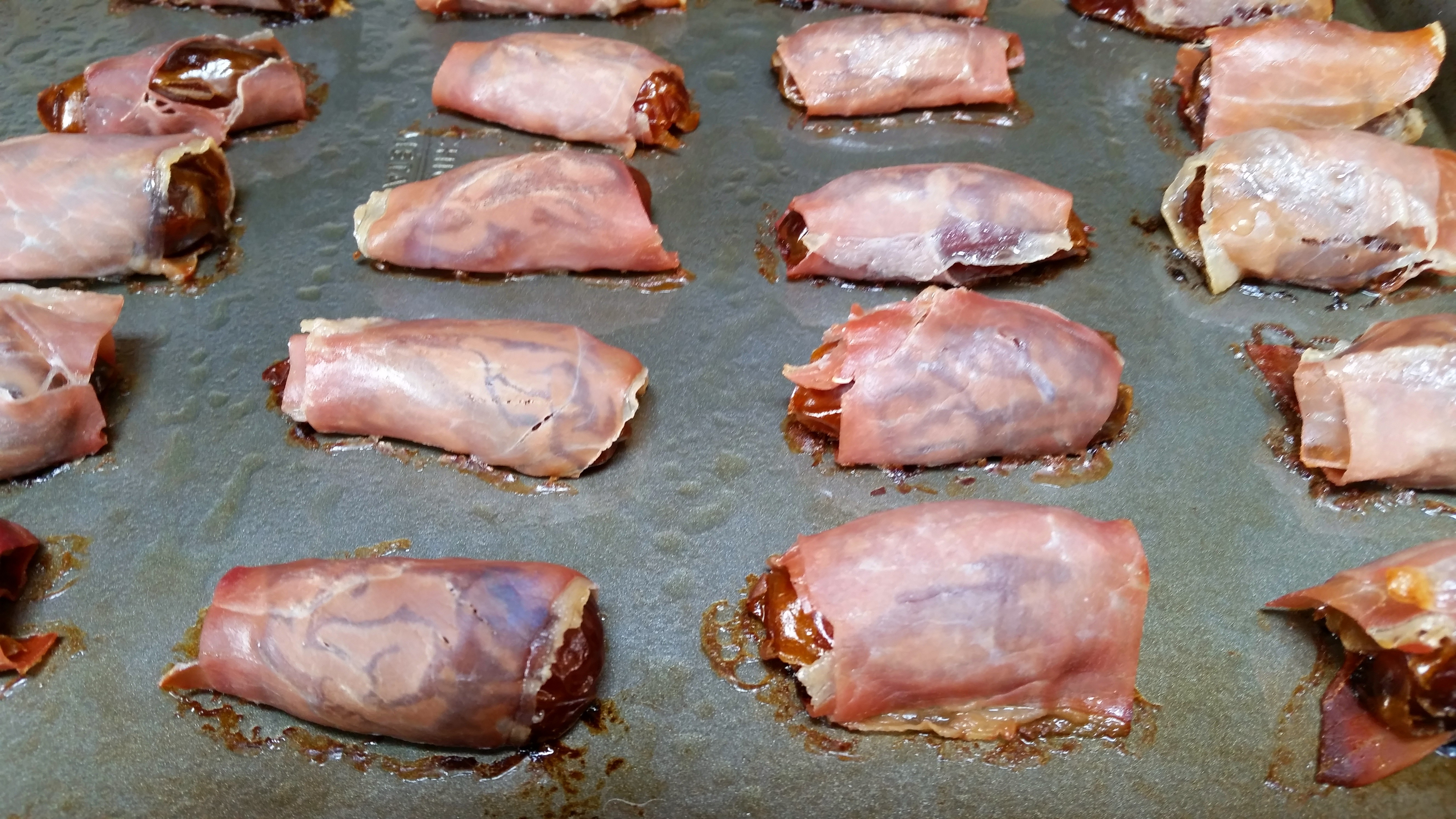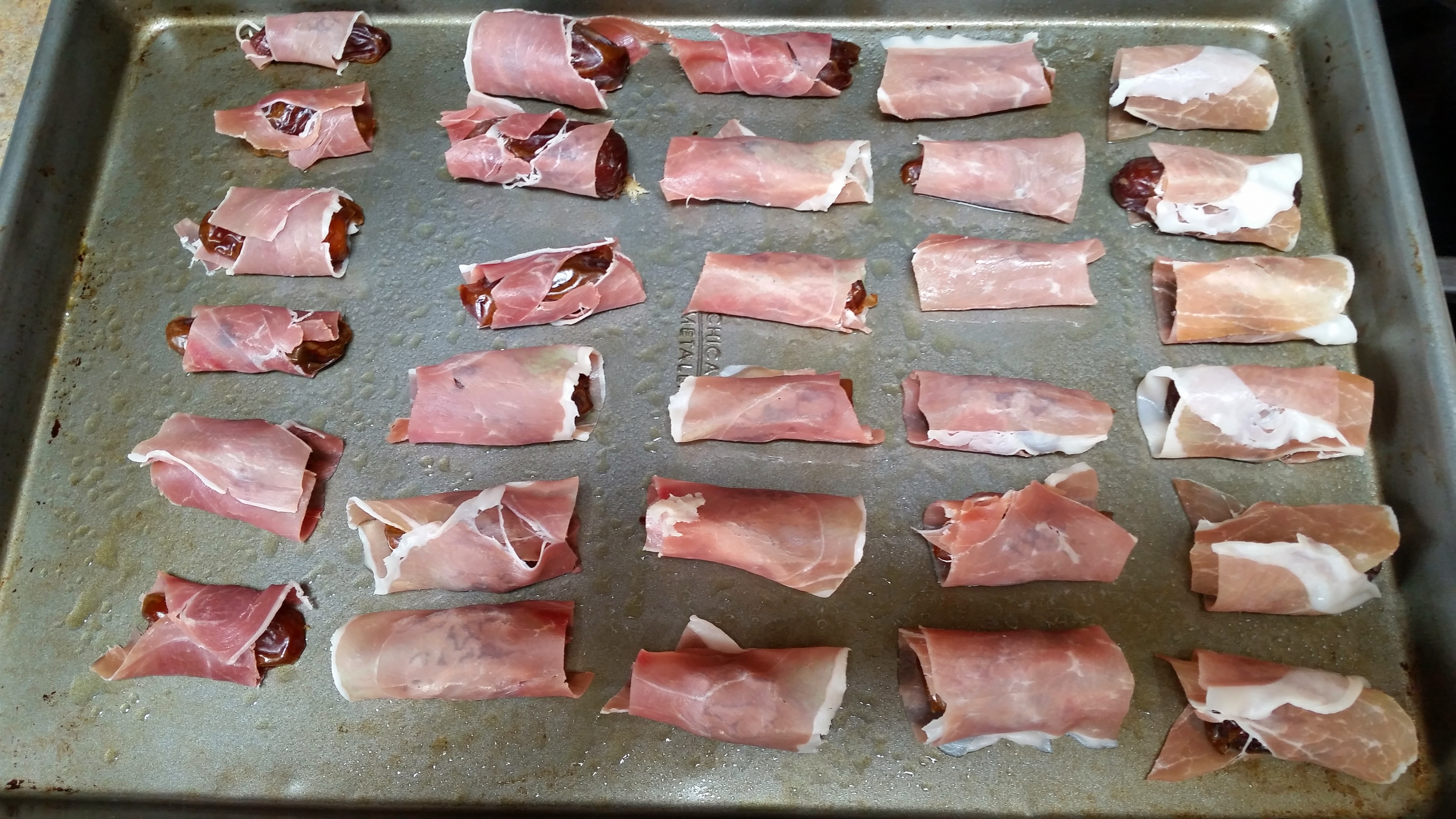 Kind of a sneaky way to measure this is to take the prosciutto out of the package, line up some dates along the length of it, and slice in between the dates. Now you know they’ll fit!