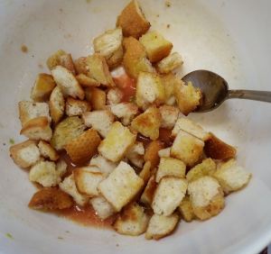 While the garlic is sizzling and filling your kitchen with incredible aromas, cut or tear the bread into cubes.